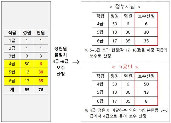 그러나 건강보험공단은 관련 규정을 위반하여 5급과 6급 현원에 대해 상위직급인 4급과 5급의 보수를 적용하여 인건비를 편법으로 편성함으로써 2016년부터 2023년까지 8년간 총 5,995억 원을 과다하게 편성했다.