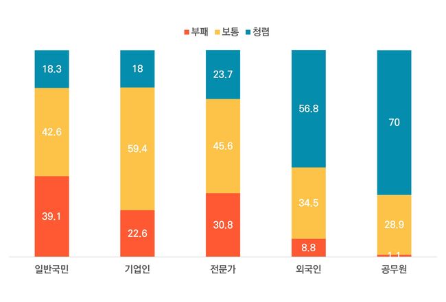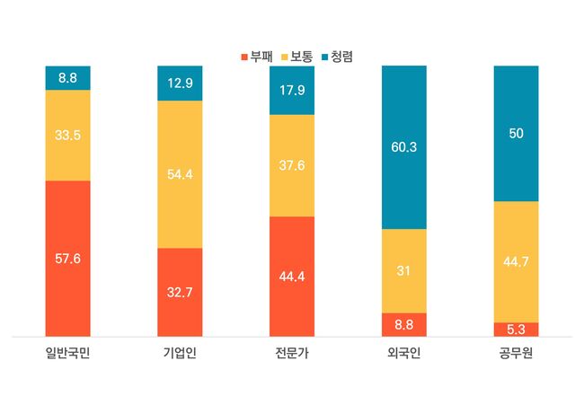 우리 사회가 ‘부패하다’라고 인식하는 비율은 일반국민(57.6%)이 가장 높았고 그 뒤를 이어 전문가(44.4%), 기업인(32.7%), 외국인(8.8%), 공무원(5.3%) 순으로 나타났다.