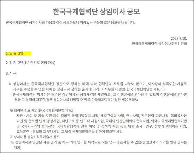 <본부장 직위 명시 없이 '인원: 2명'으로만 명시된 상임이가 모집 공고문, 출처: 한국국제협력단 홈페이지>